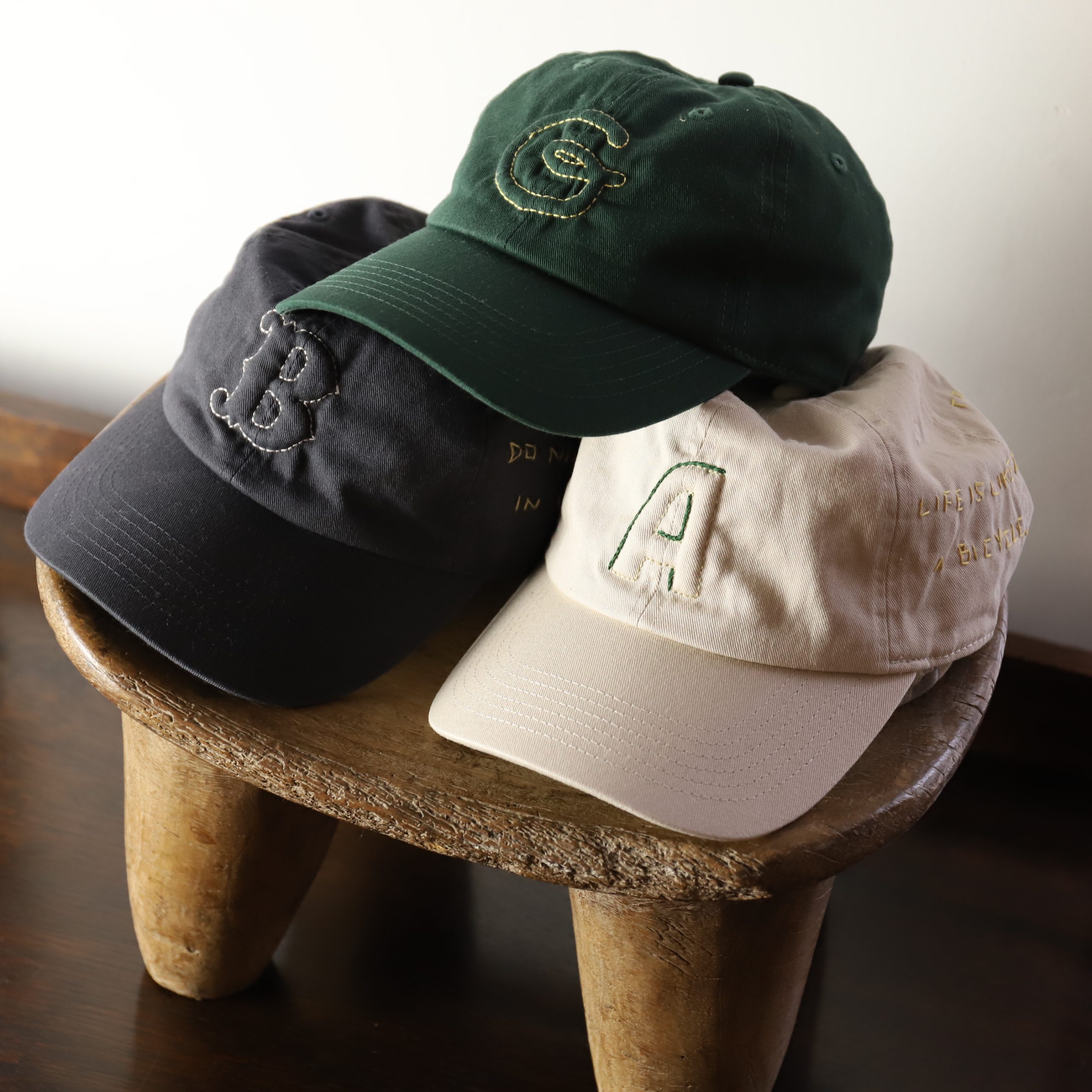 もともとデザイナーの奥山さんが商品化はしていなくて、ご自分のバッグやキャップに刺繍していたアイディアを拝借させていただきました。全て奥山さん自身がハンドステッチで制作しています。