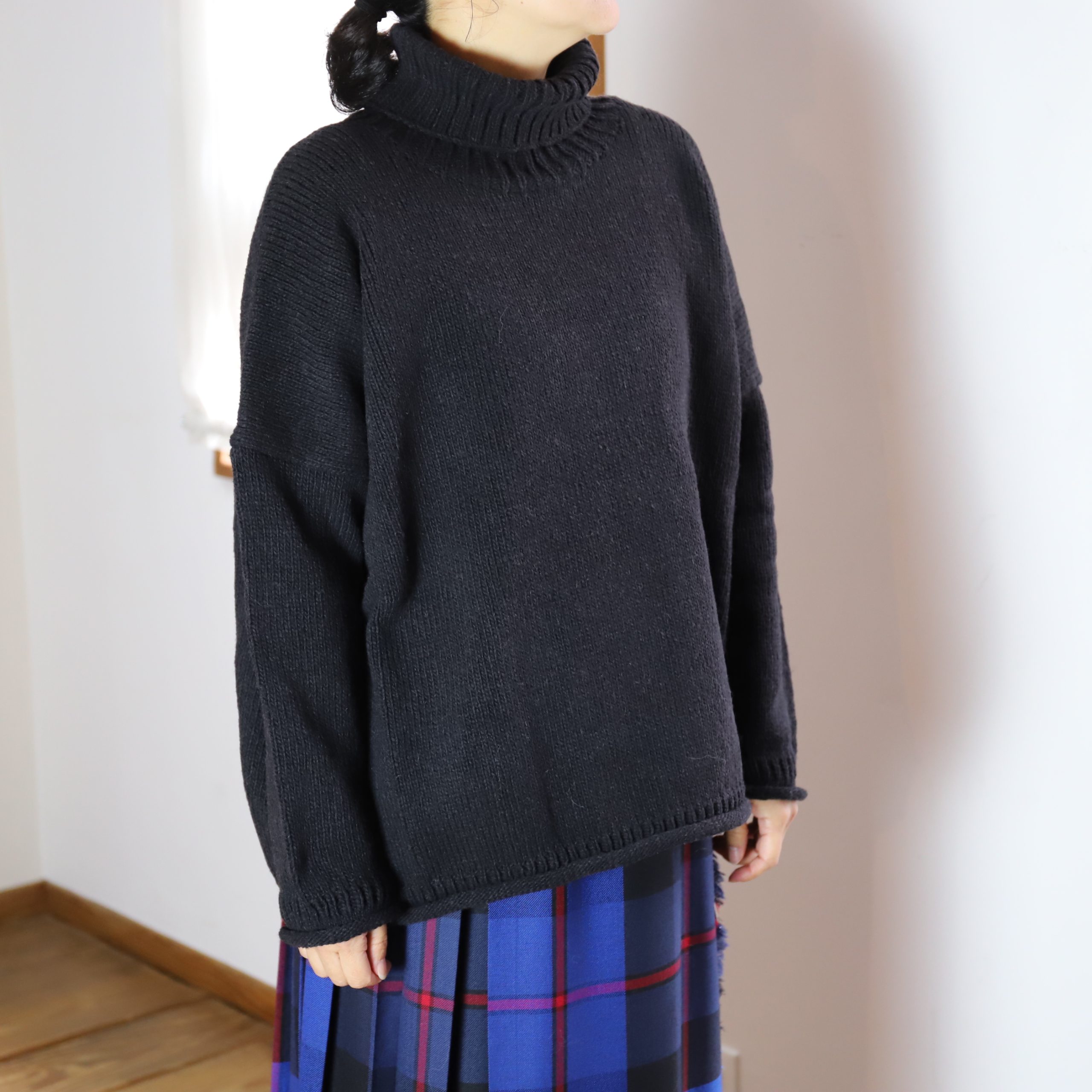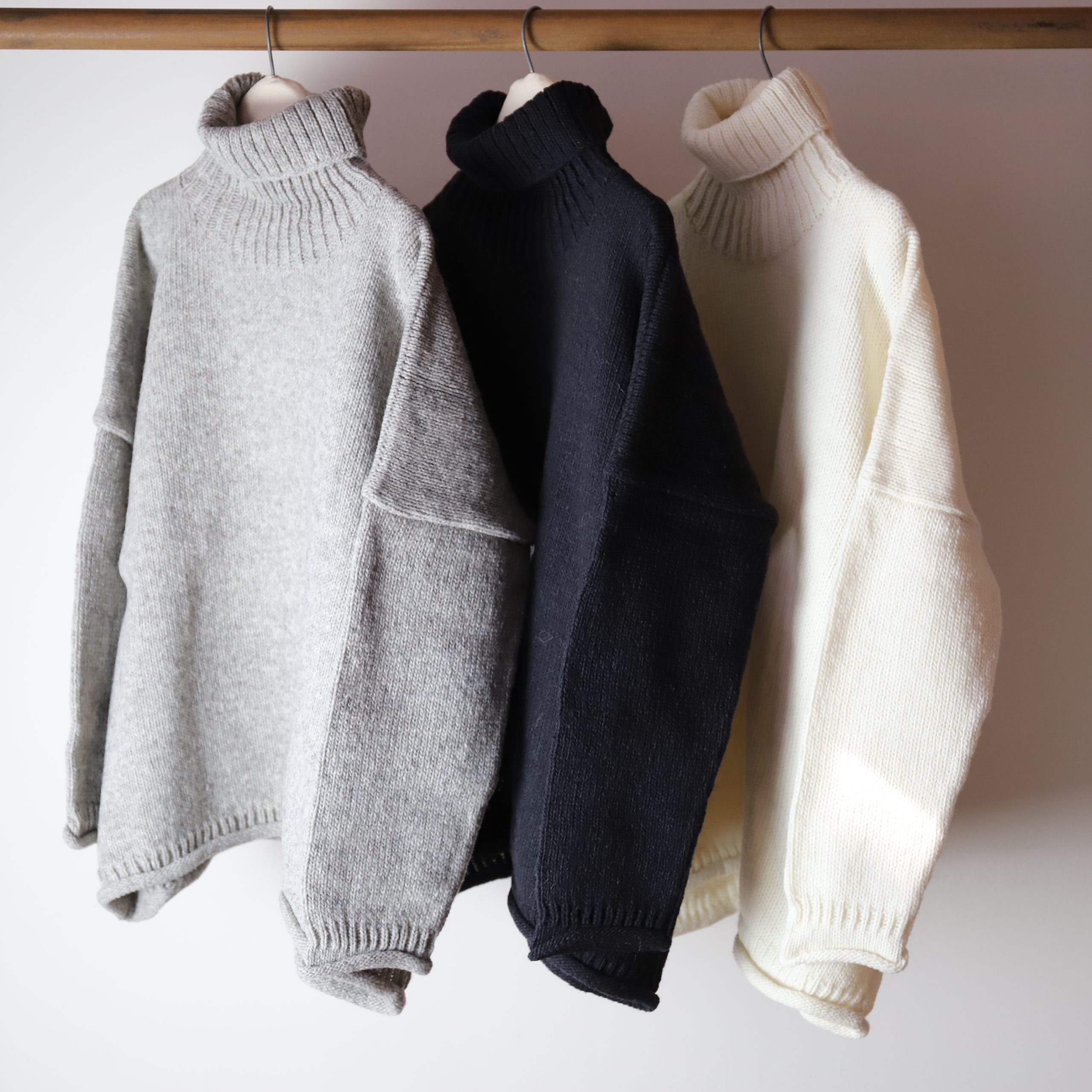 袖・裾のロールや編み地のデザインもポイント。長めのタートルは折り返しても良いですし、寒い時は伸ばしても。