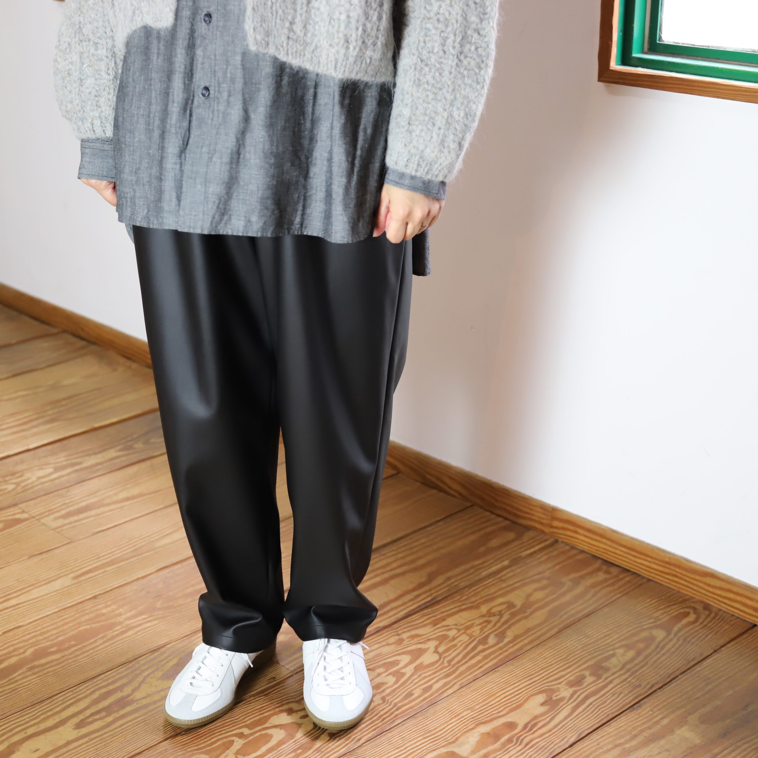 合わせているフェイクレザーのパンツ。甘めのトップスにピリッとレザー。いいですね。こちらプライスもお手頃。合わせて店頭でぜひ。
