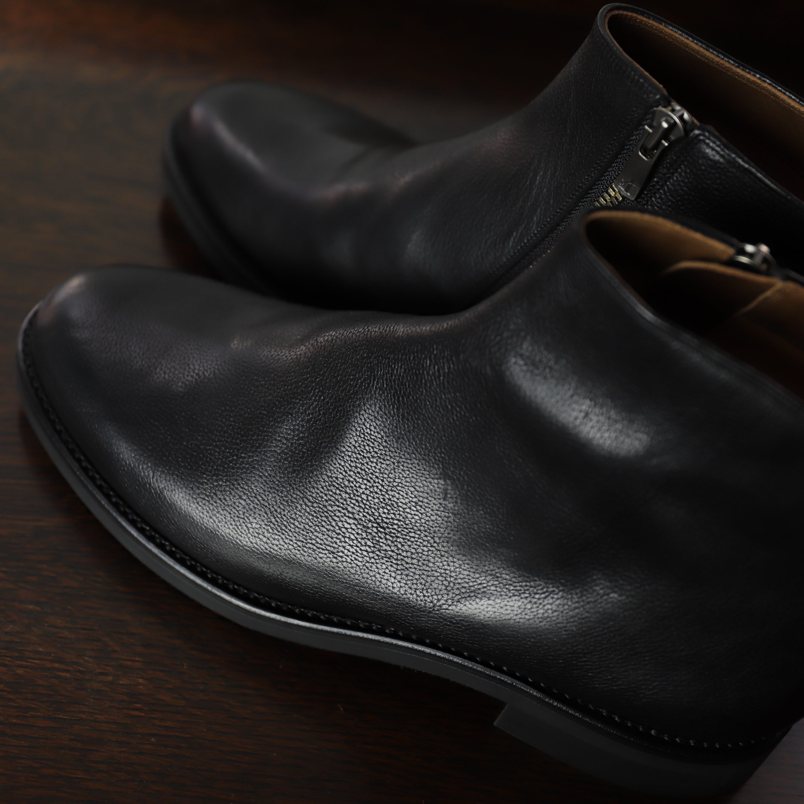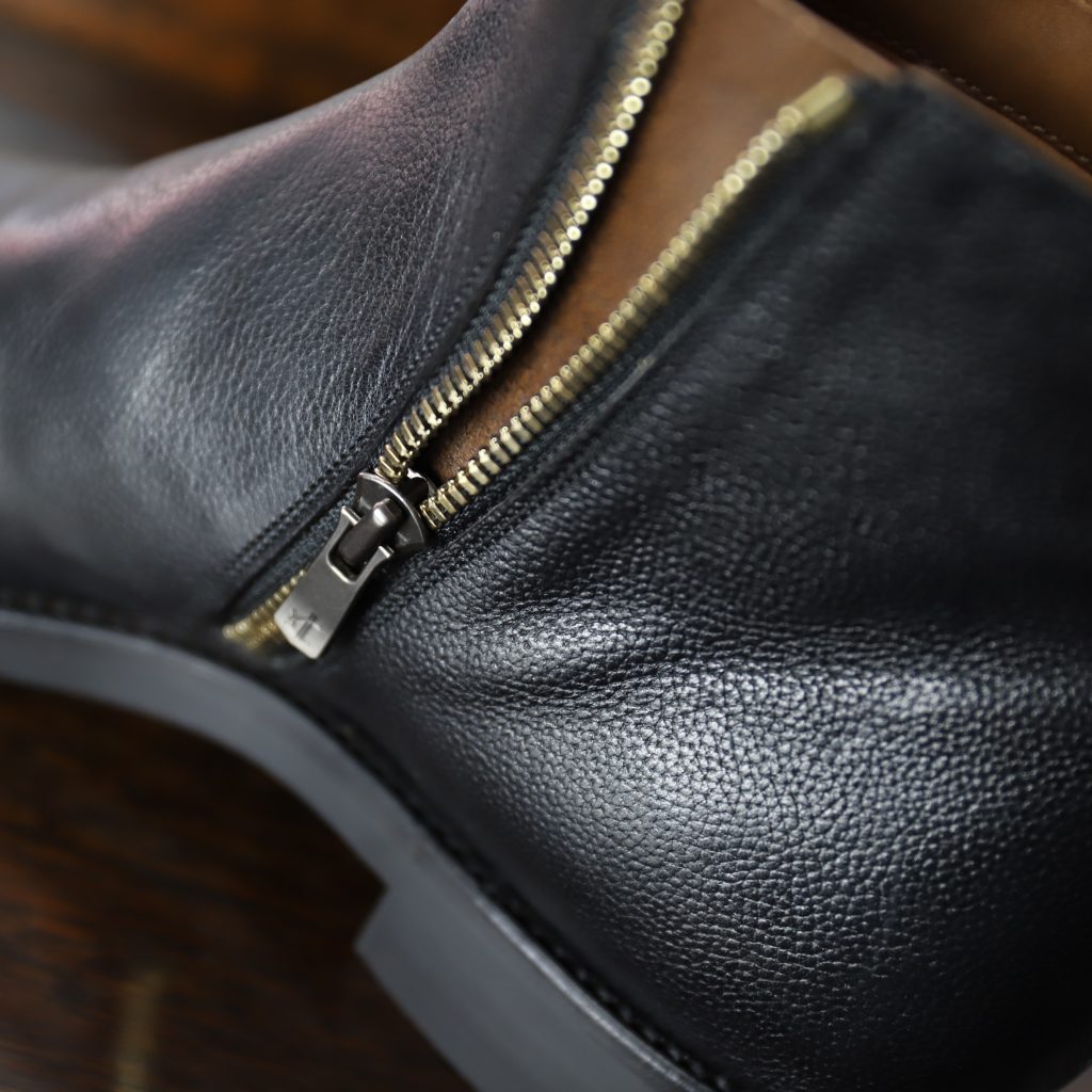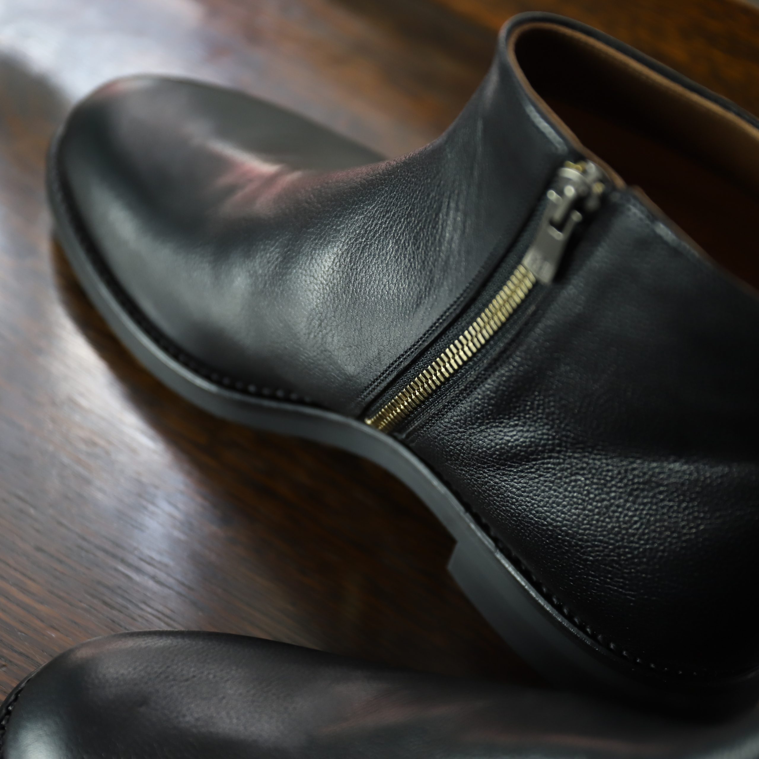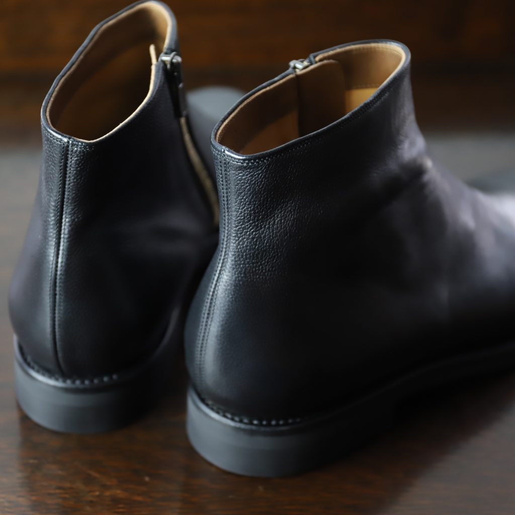 通常サイドジップのアウトサイドには接ぎが入るのですが、贅沢に一枚革で制作されており、ミニマルな印象と、履き込んだ時のシワ感をより楽しんでいただけます。