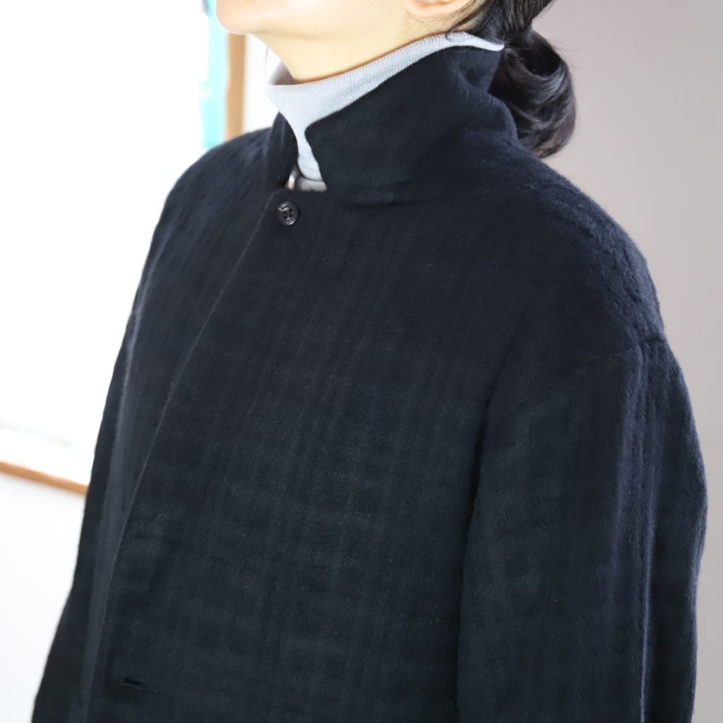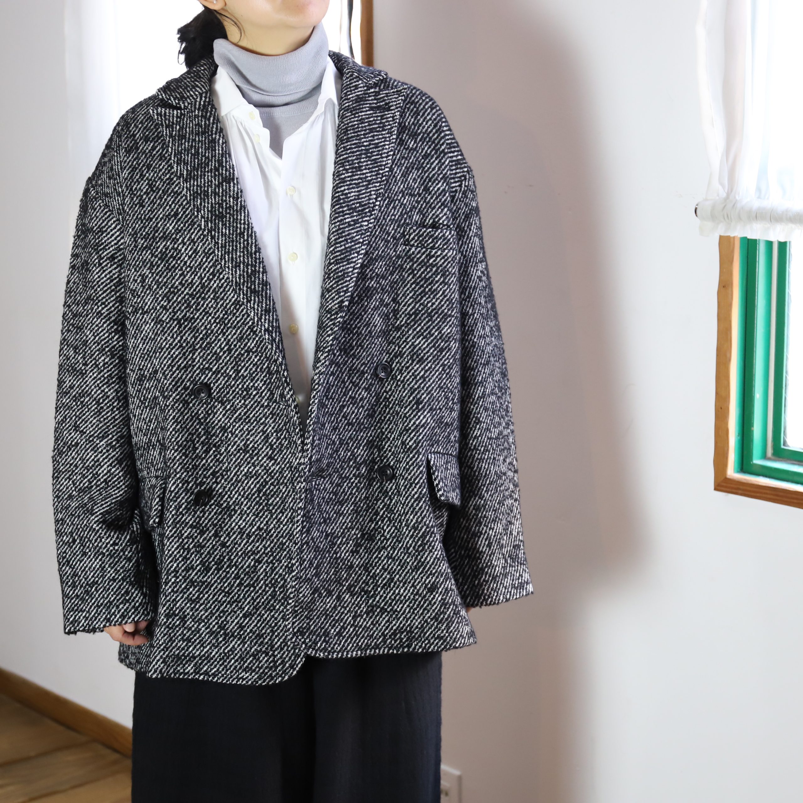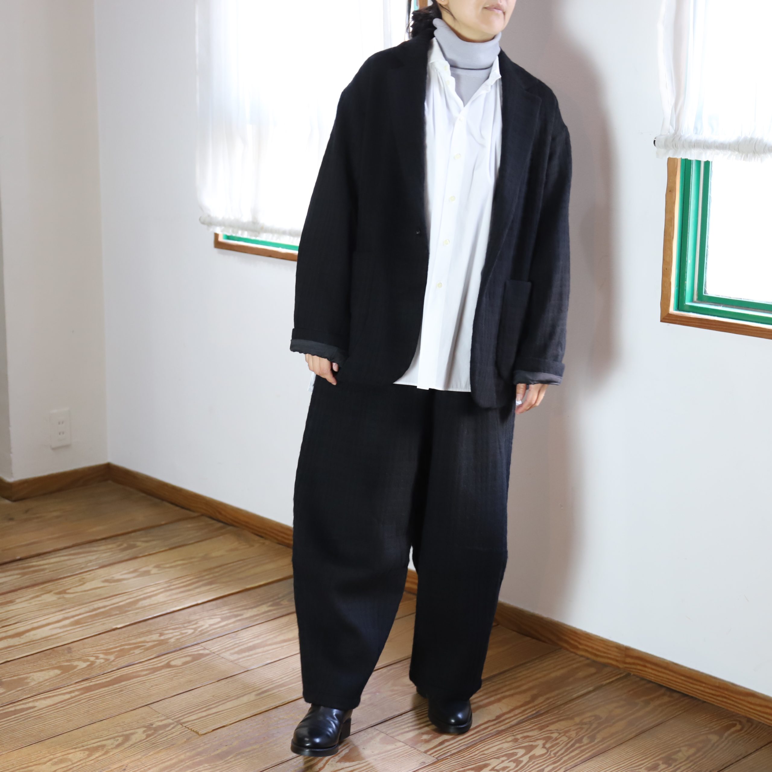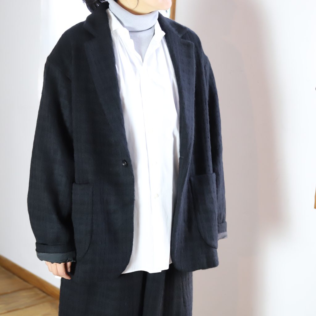 ざっくりオーバーサイズのシングルテーラードジャケットは上までボタンも留められます。この生地が活きるシンプルさが良い。
