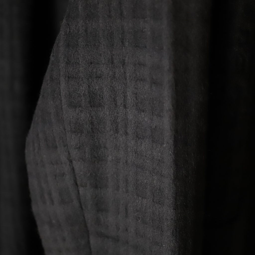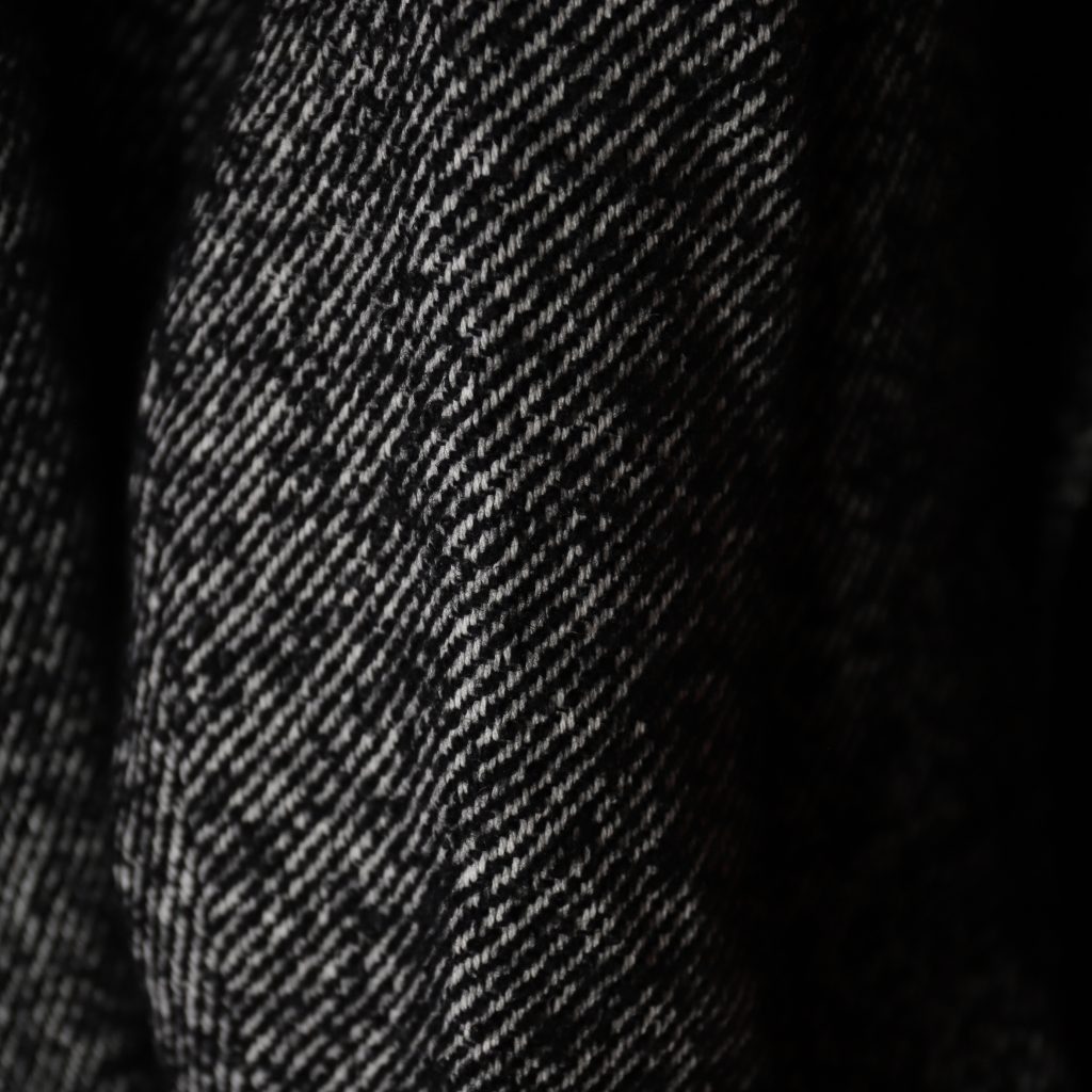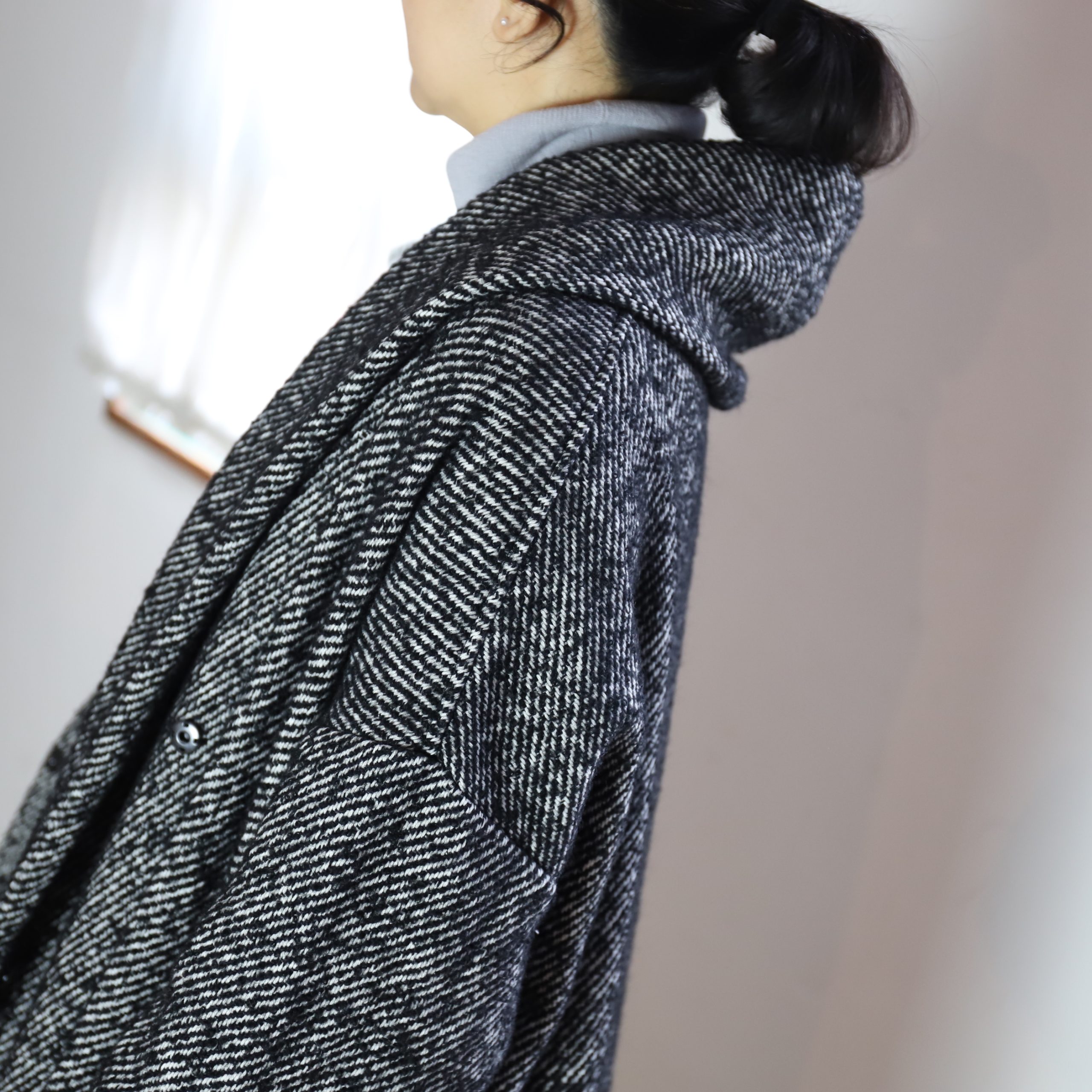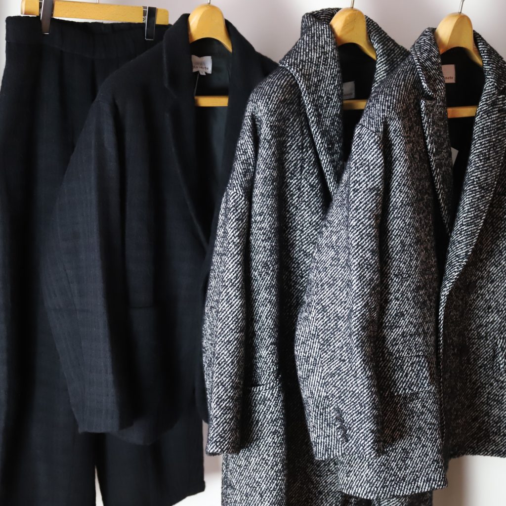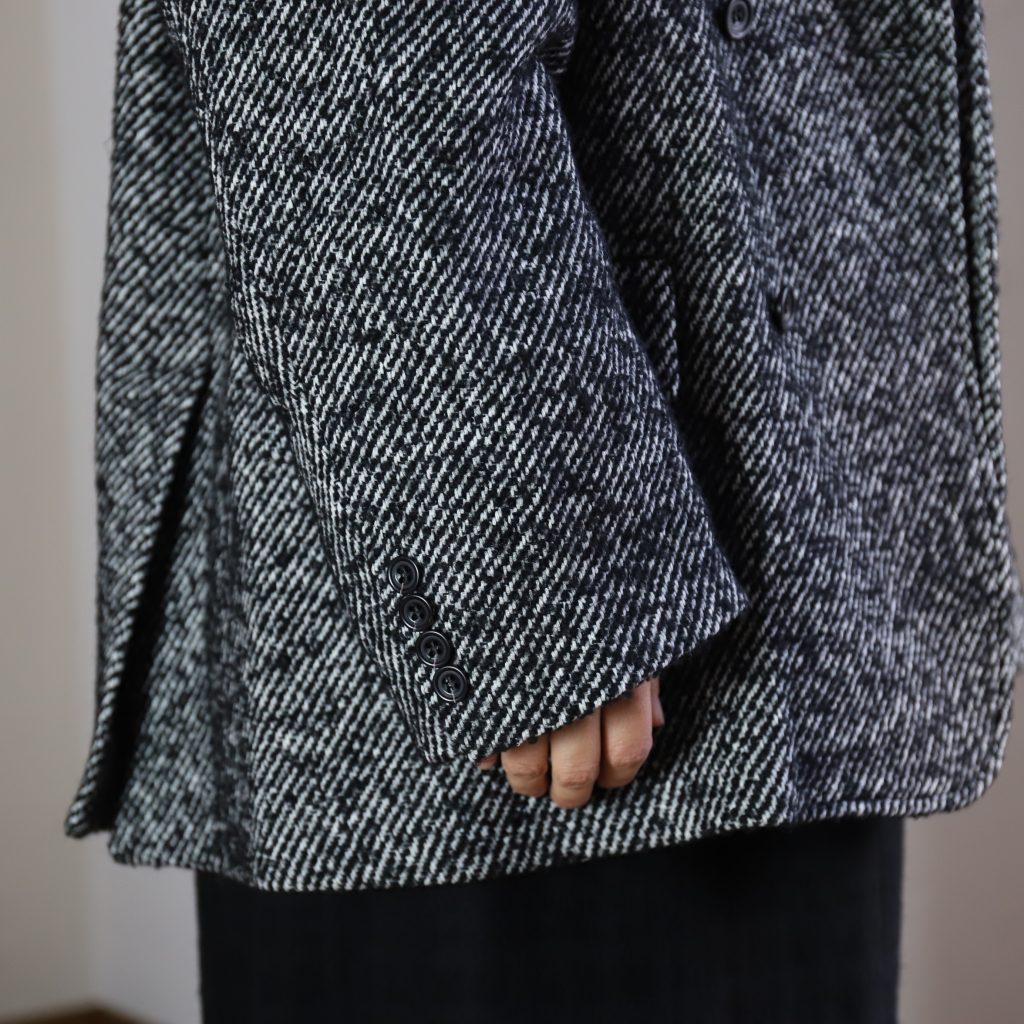 ざっくりオーバーサイズのシングルテーラードジャケットは上までボタンも留められます。この生地が活きるシンプルさが良い。