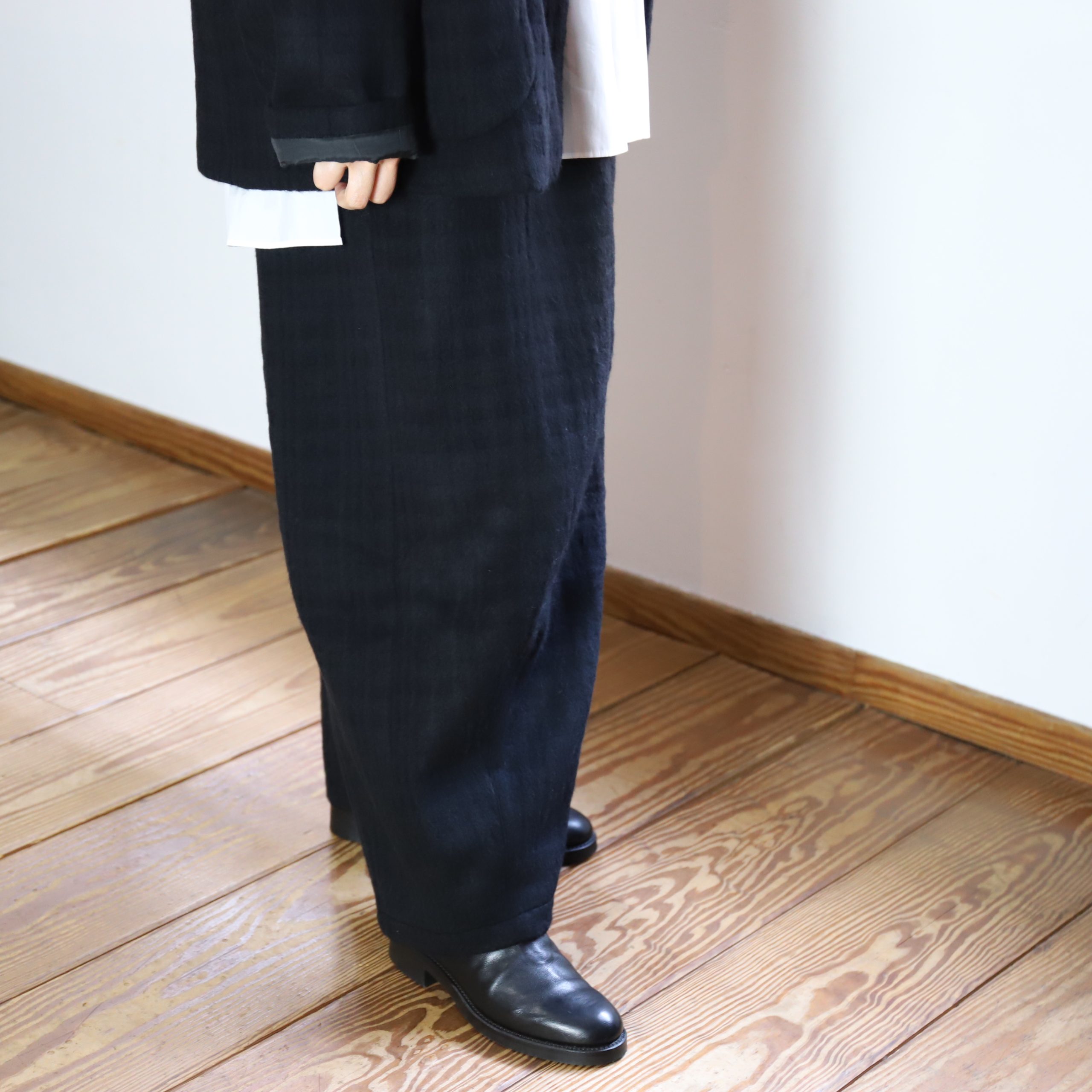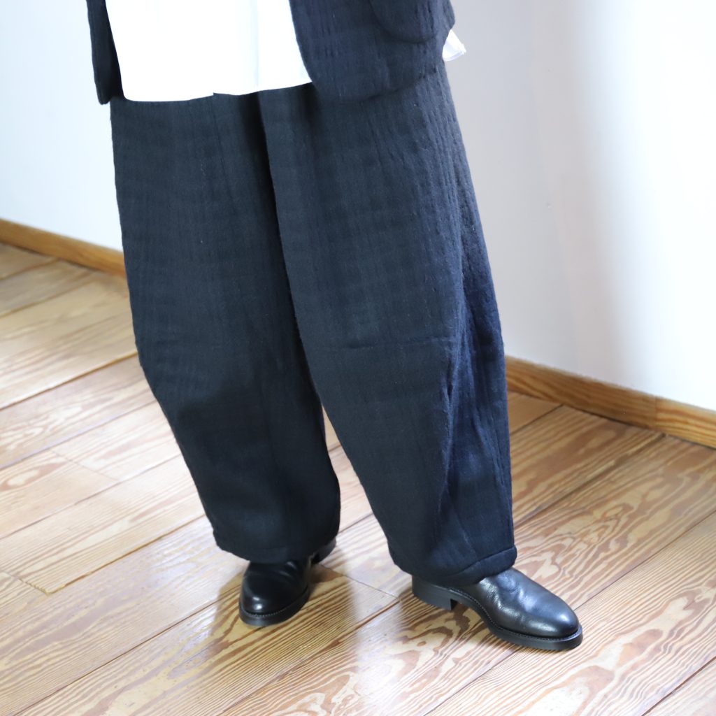 パンツは独特の立体的なワイドシルエット。合わせて着た時のバランス最高です。
