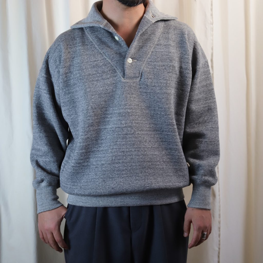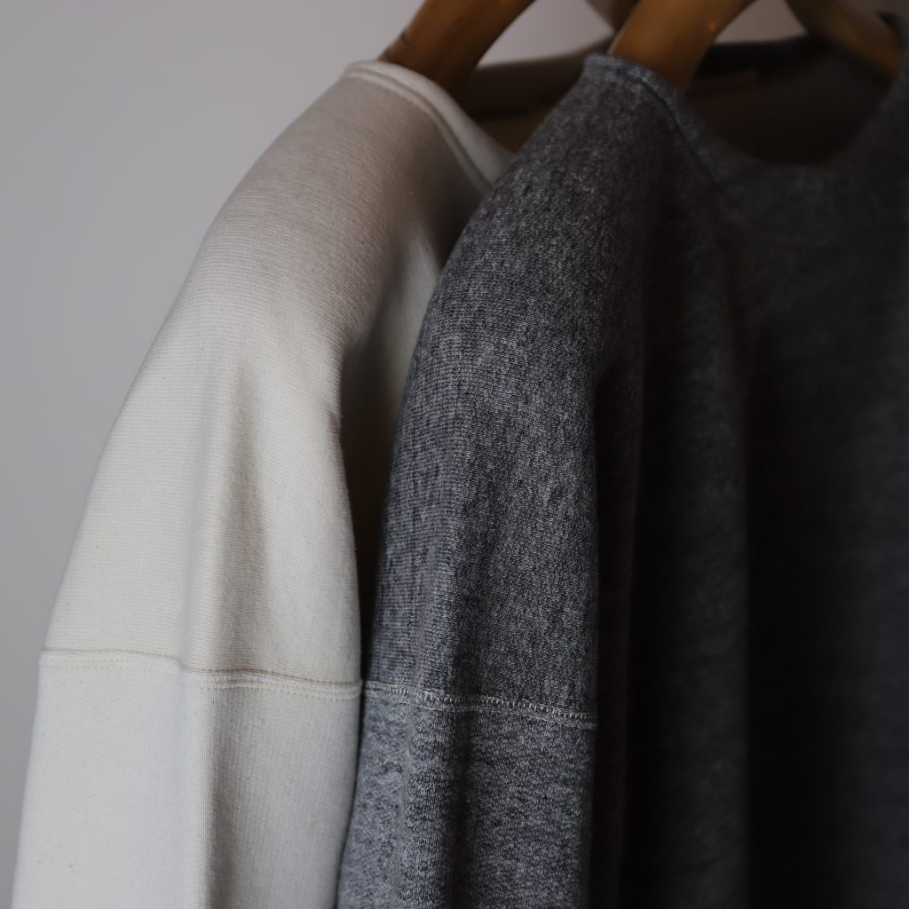 首周りにリブではなくボートネックのような軍もののディテールを参考にし、スポーティ見えせずクラシックな印象に仕上げています。