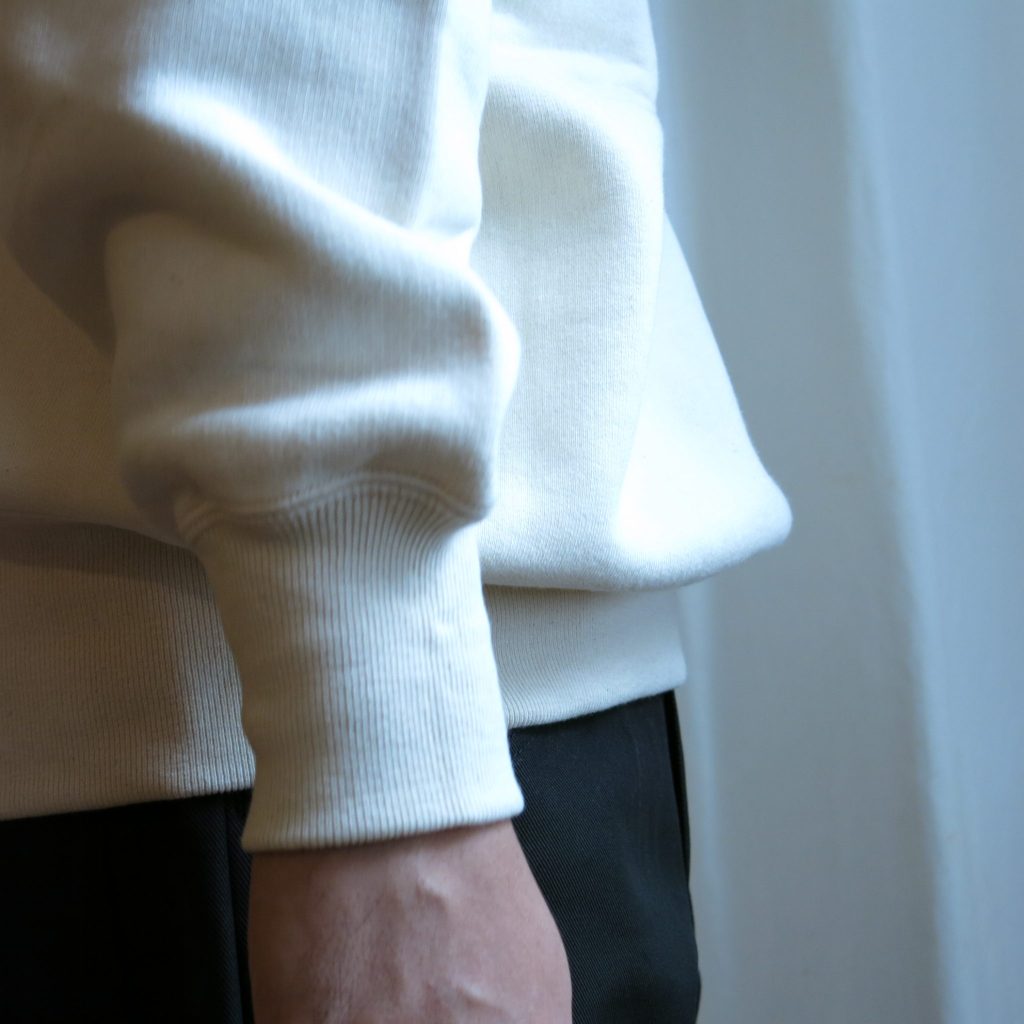 シルエットもやはり抜群。リブが効いたニットのような見え方は、スラックスで上品に、ワイドパンツでメリハリつけてと、一般的なカジュアルなスウェットとはまた違うスタイルを組めます。