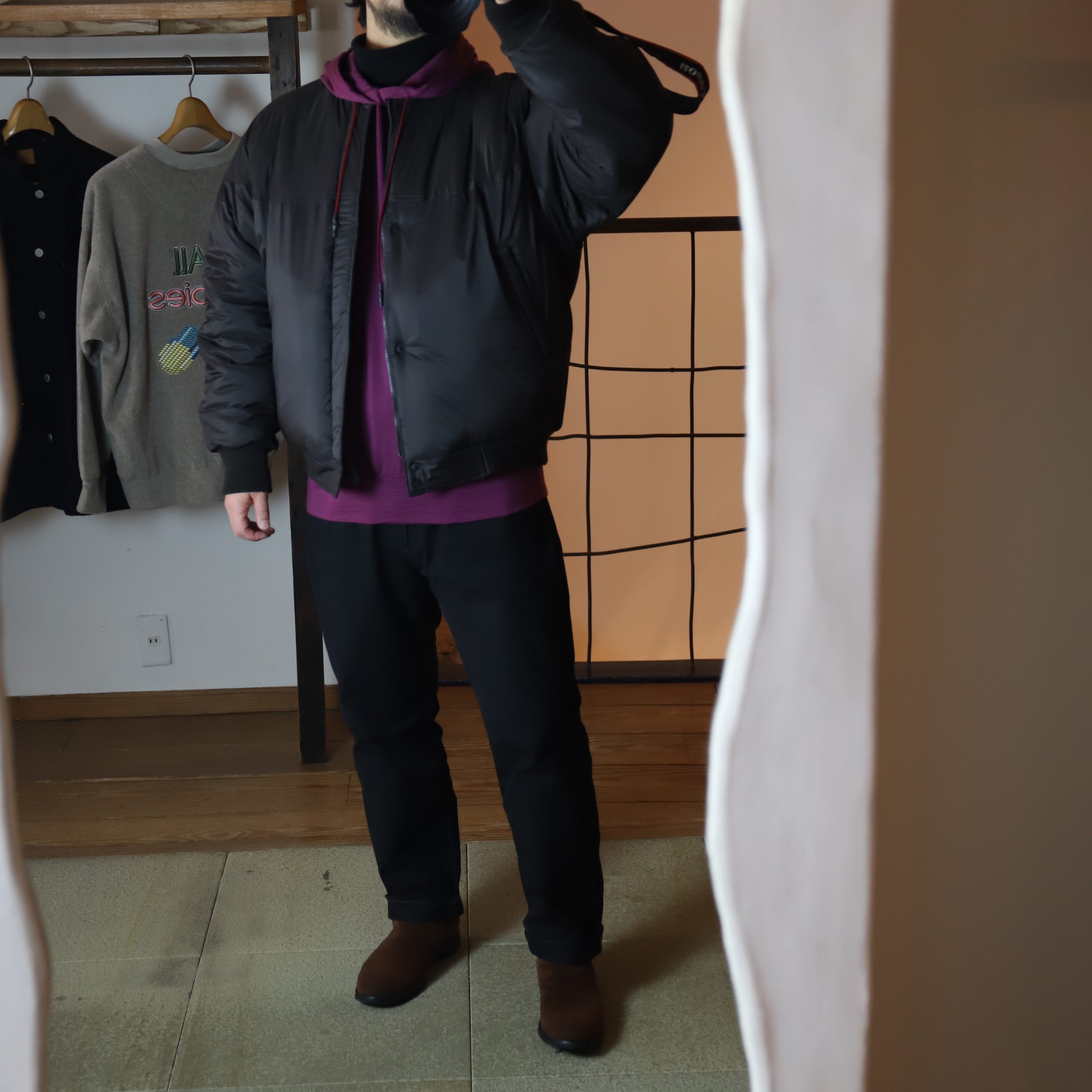 インナーにはメリノフーディー。スウェットだと嵩張りすぎるところにこのメリノです。