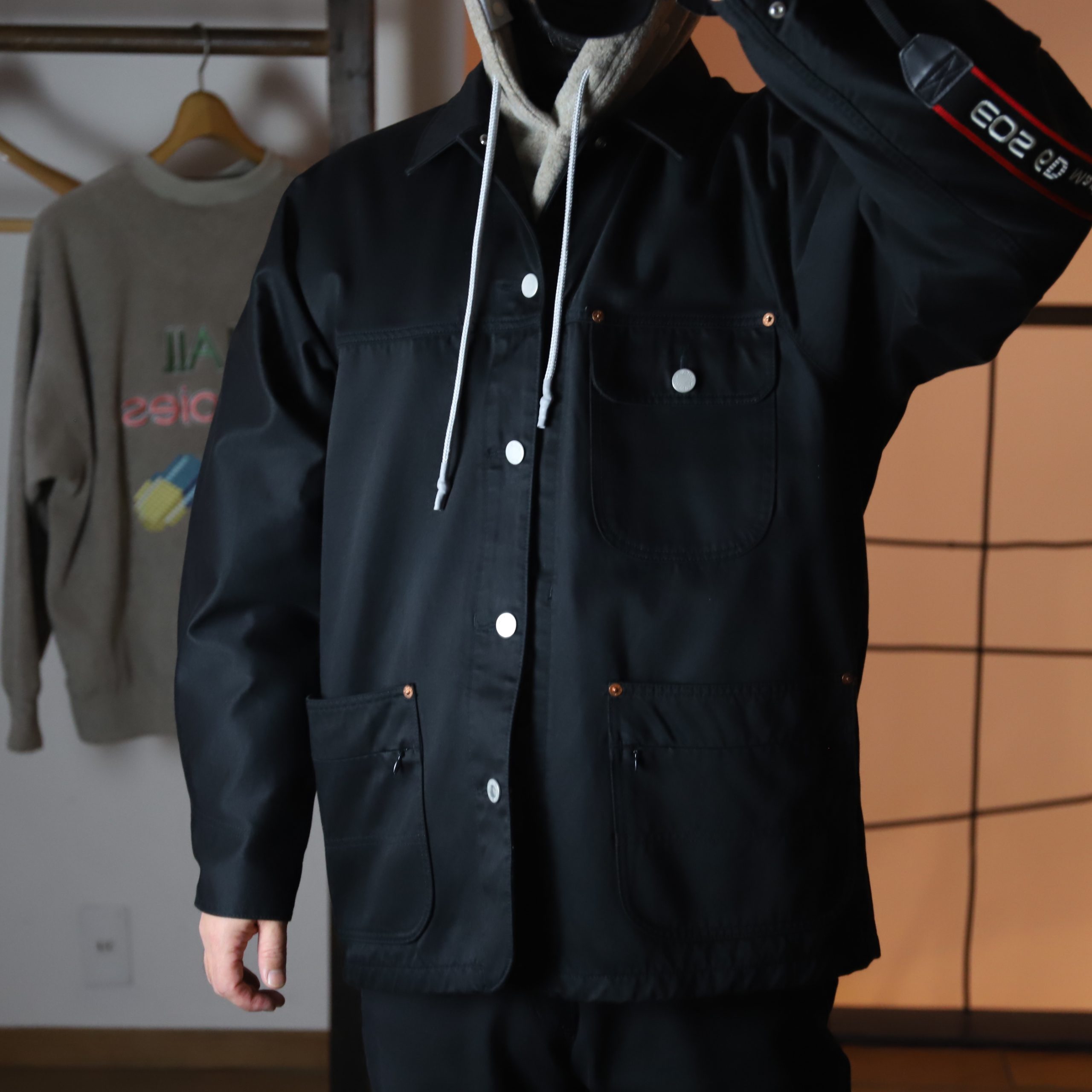襟なしなのでパーカー抜群ですし、何を合わせてもキマります。