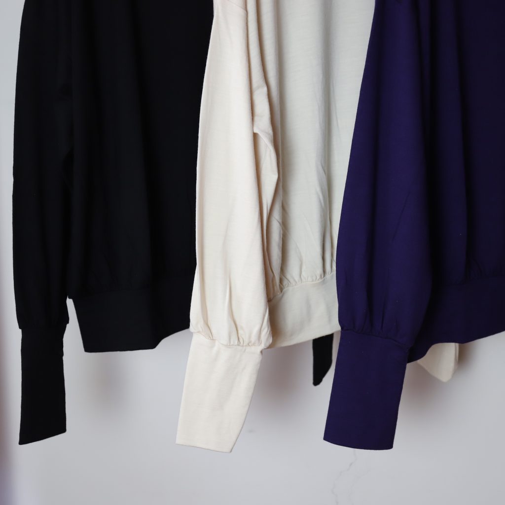 ウォッシャブルウールの機能性はもちろん、ウール特有の滑りや落ち感。計算されたルーズフィッティングと相まって無二のカットソー。