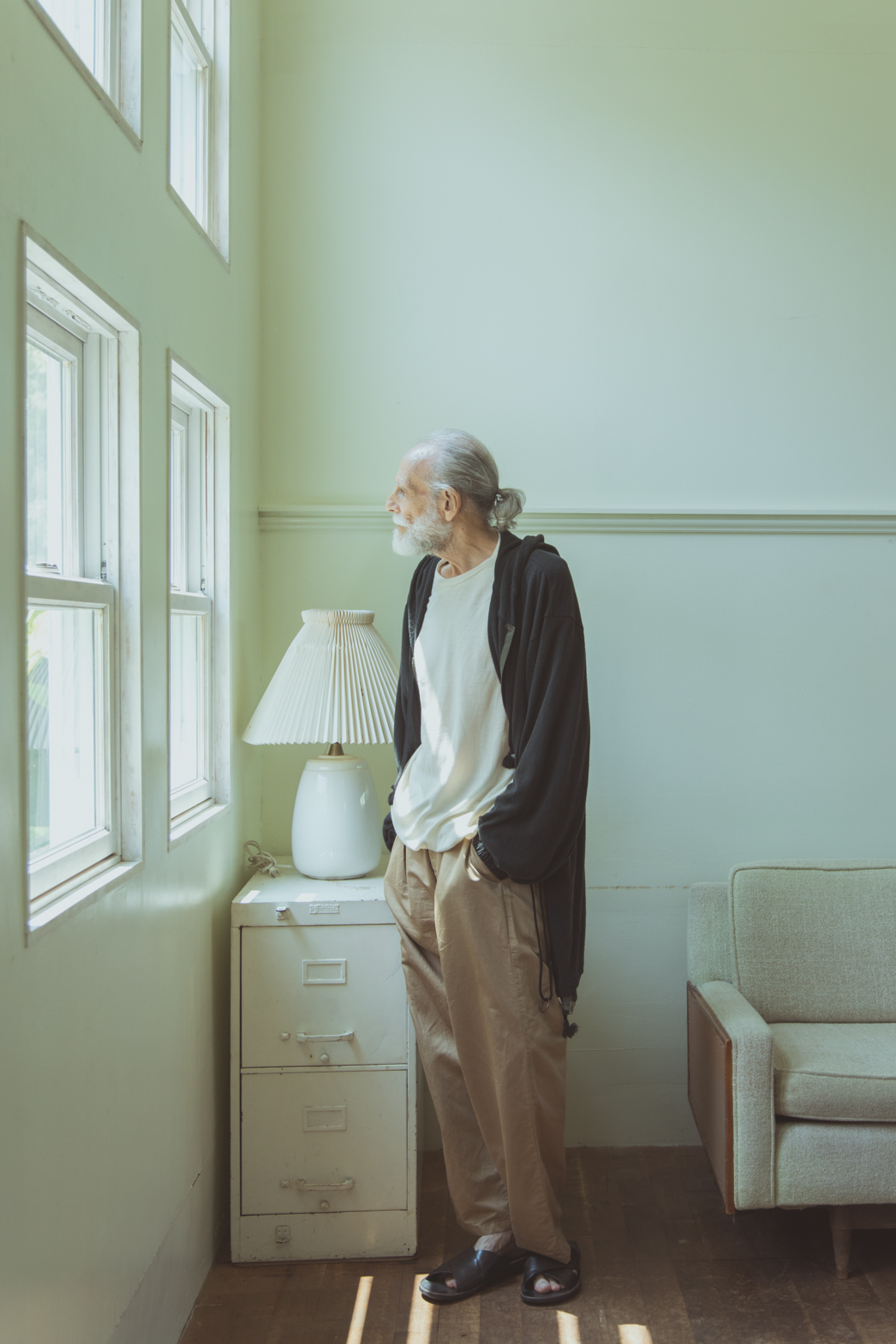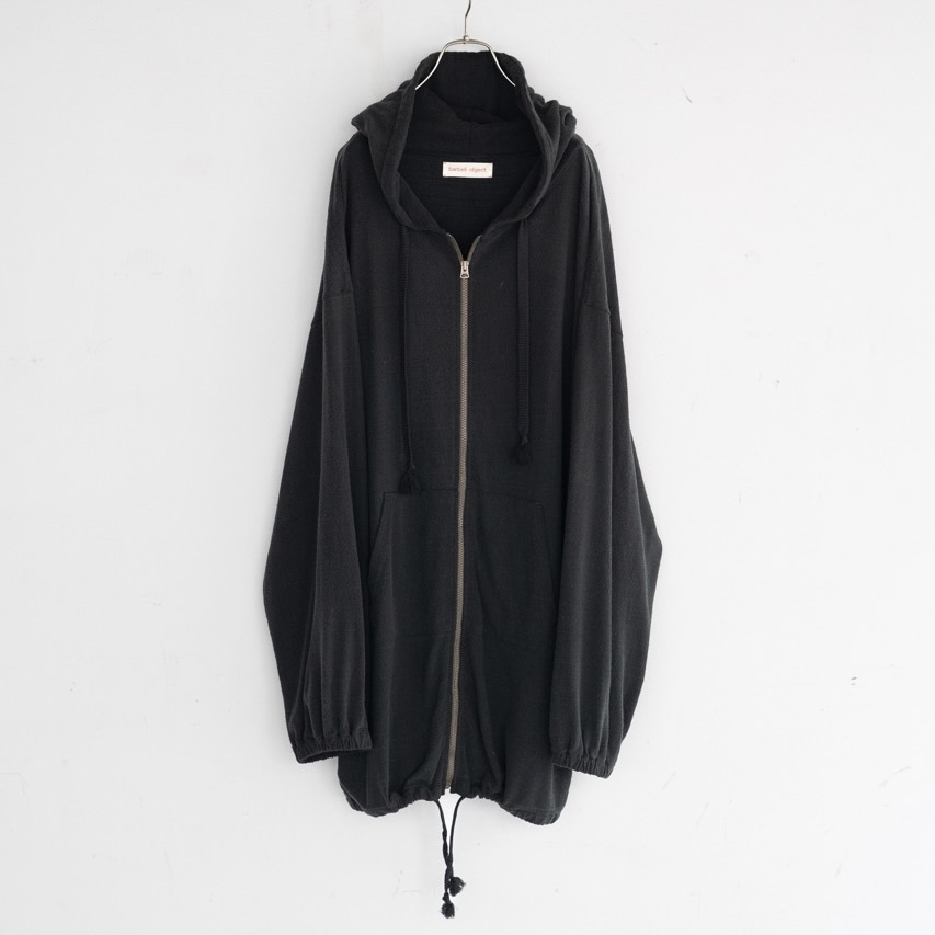 シルク100%ネップのロングフーディーとサルエルファスナーパンツのセットアップ。