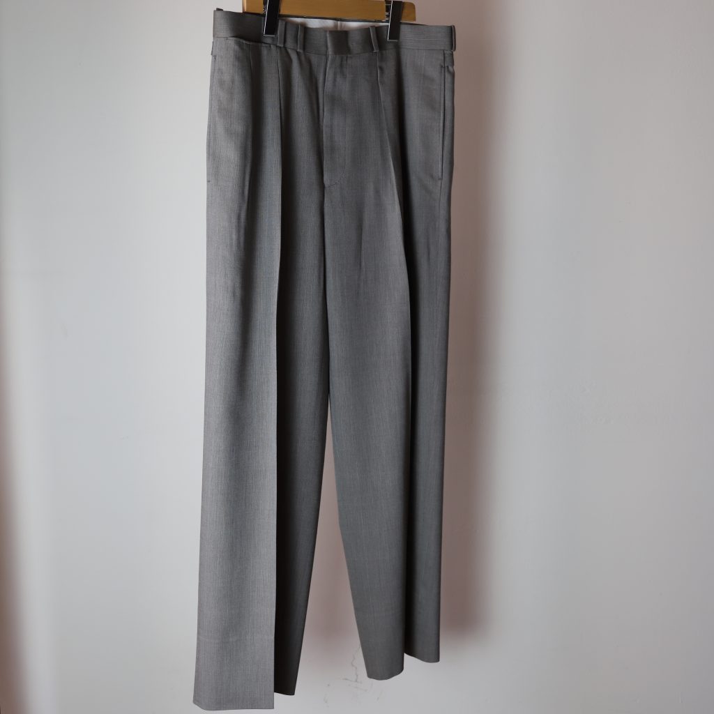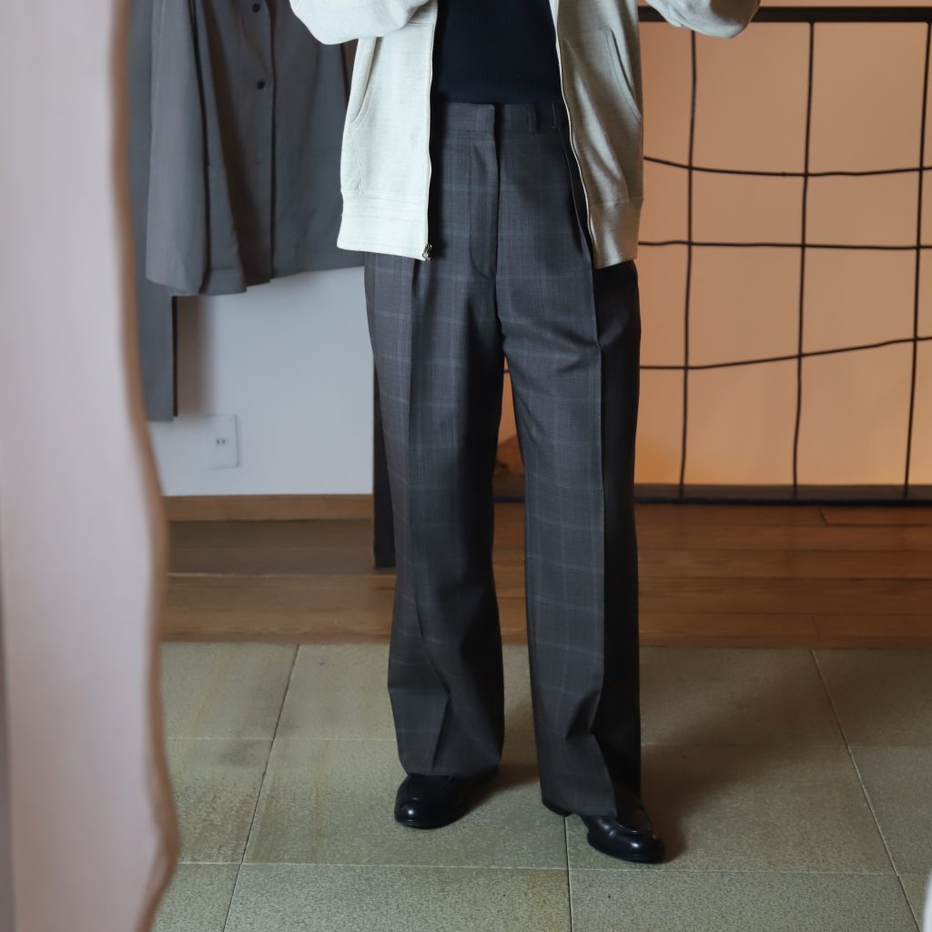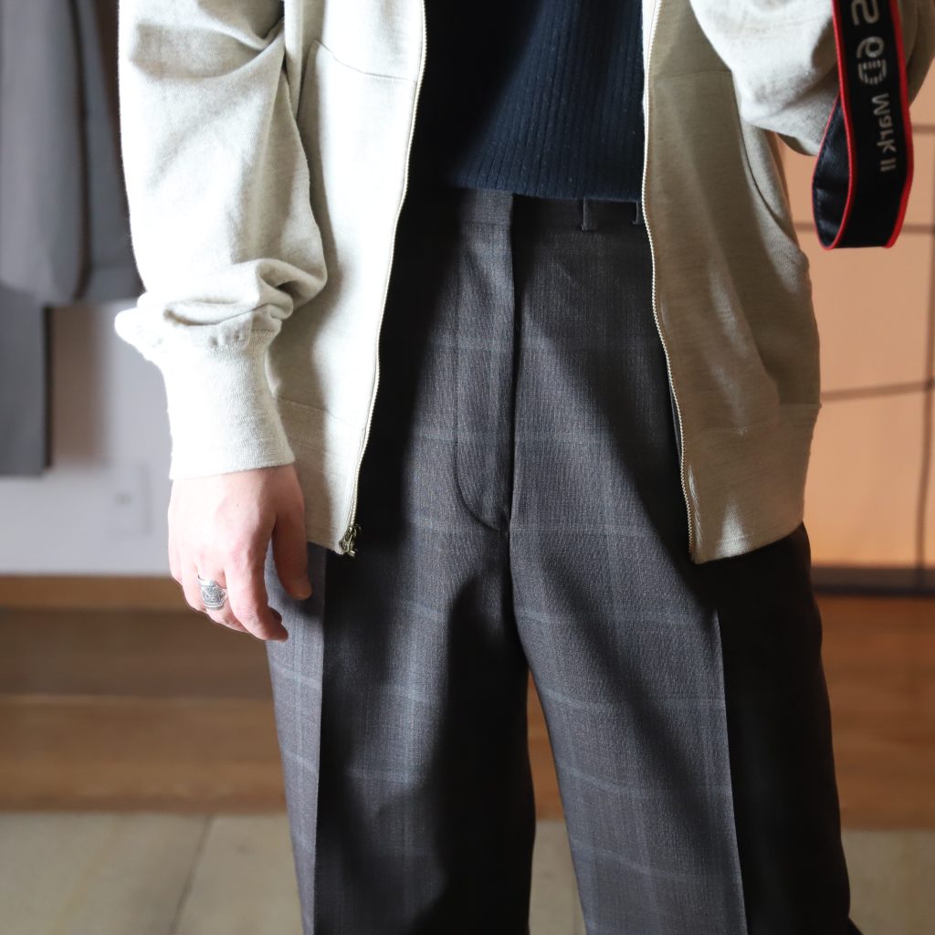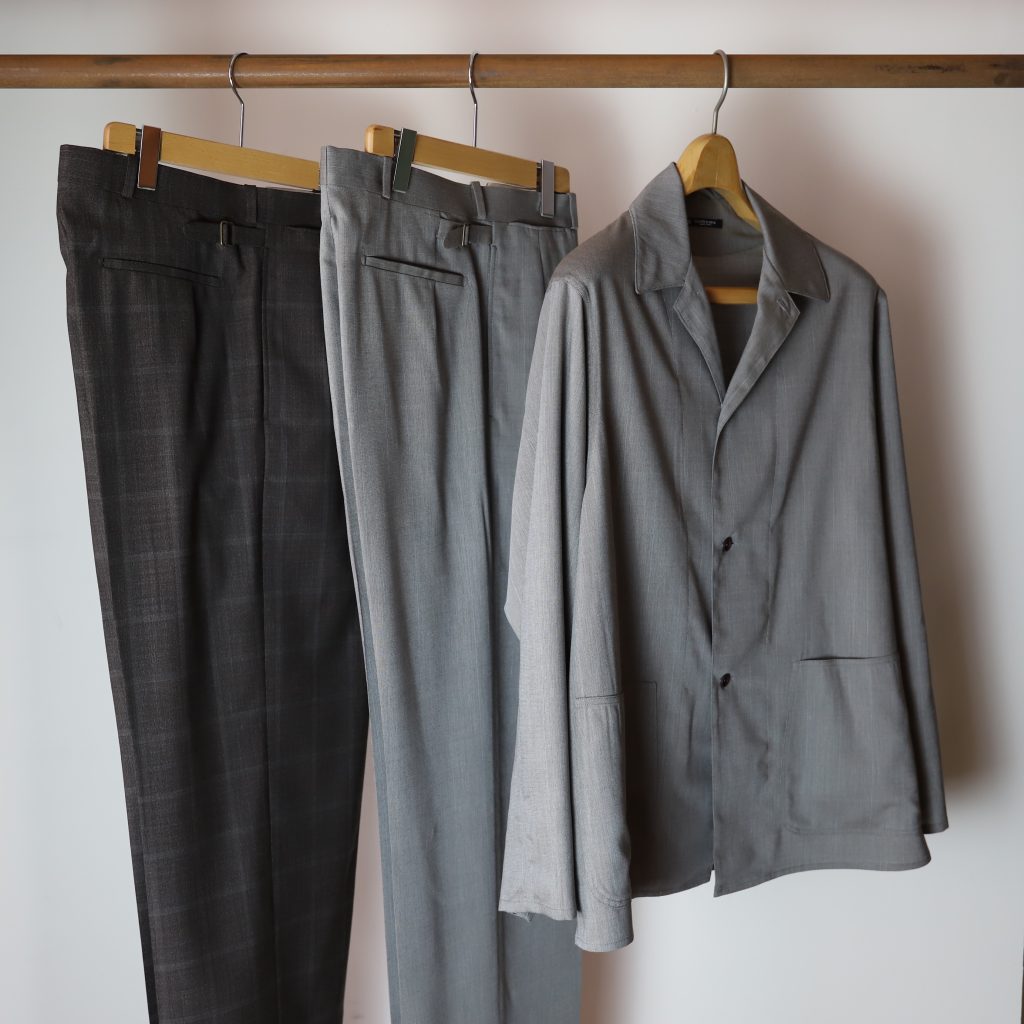 上質なスラックスはトップスが薄くなる春夏こそ欲しい。ジェフリーは中太のストレートシルエット。しっかり主張しつつ、この太さが肌に当たらず軽快。2種はどちらもぼんやり柄が入る。Tシャツにサンダルなんか気の抜けたスタイルにジェフリーが凄くいい。