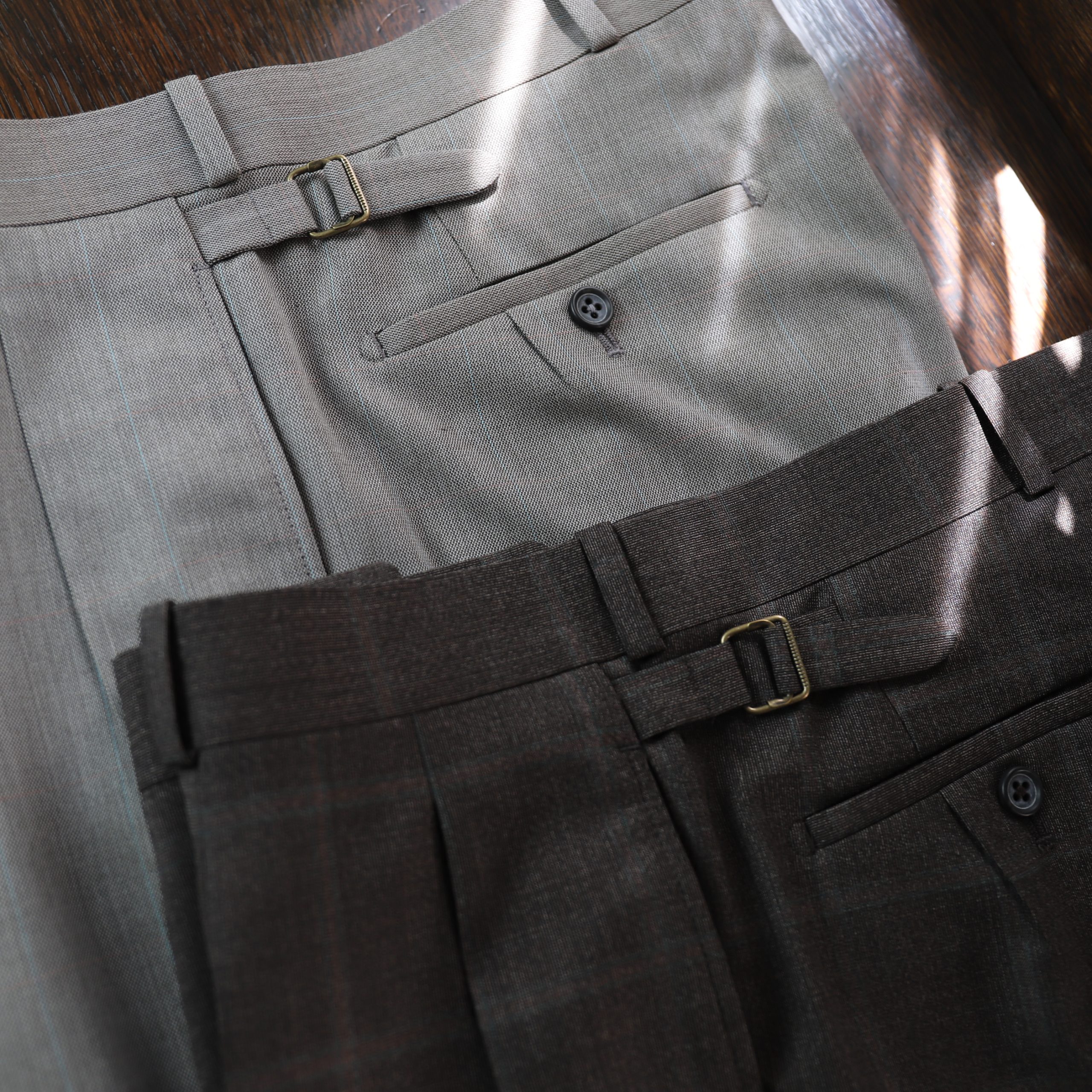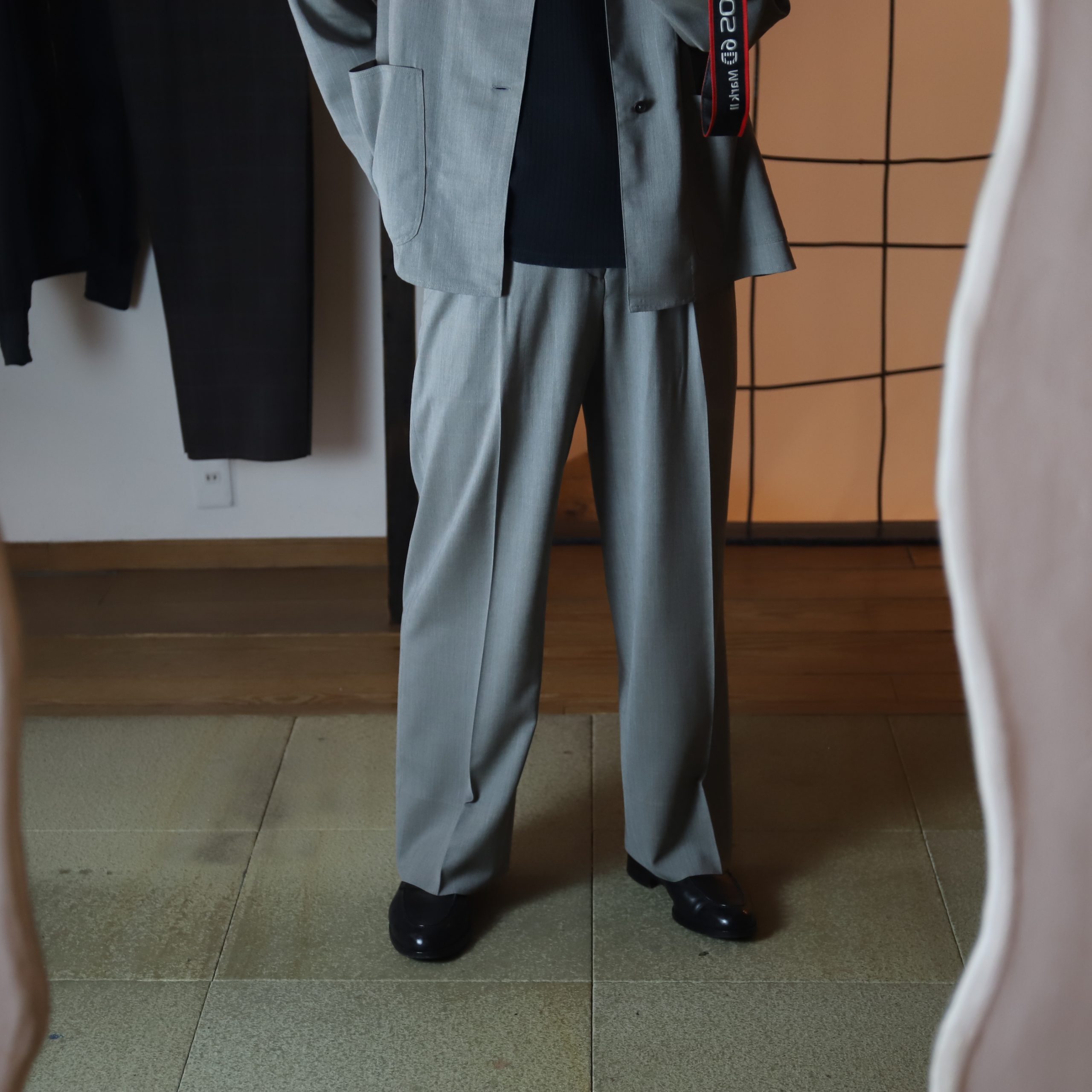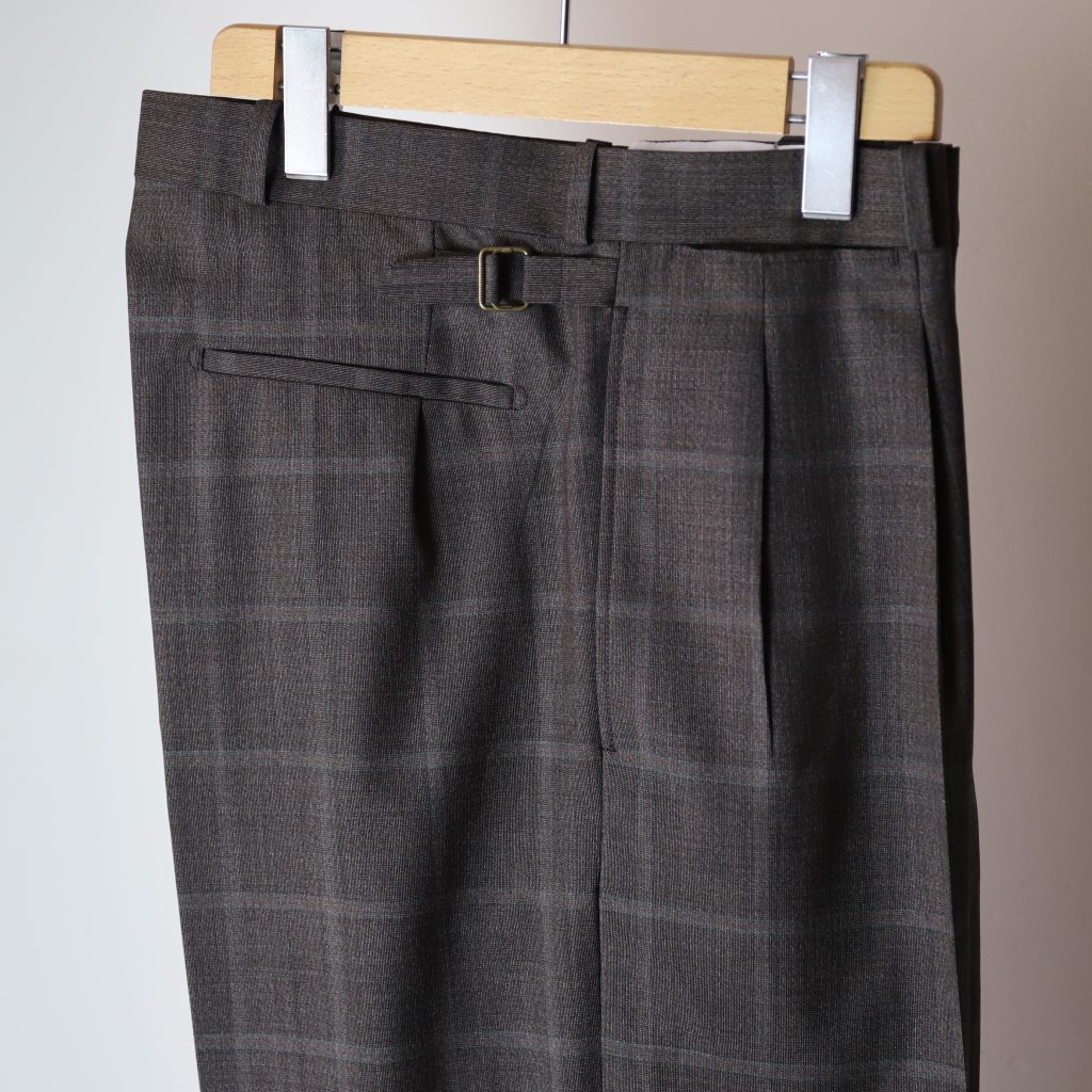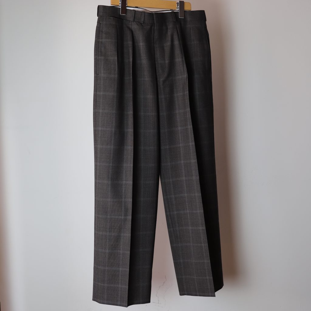 上質なスラックスはトップスが薄くなる春夏こそ欲しい。ジェフリーは中太のストレートシルエット。しっかり主張しつつ、この太さが肌に当たらず軽快。2種はどちらもぼんやり柄が入る。Tシャツにサンダルなんか気の抜けたスタイルにジェフリーが凄くいい。